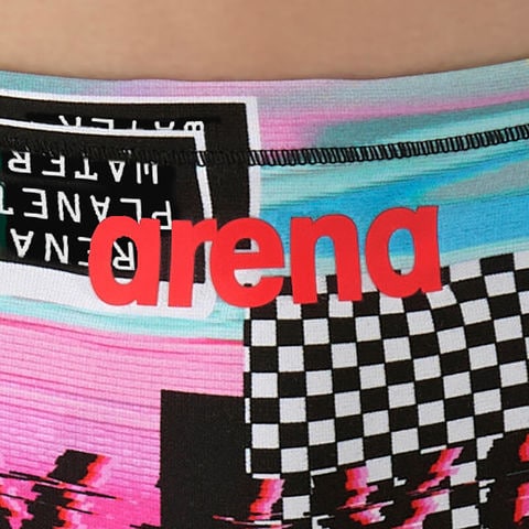 ランダムな色の変化やエフェクトが生み出す動きのあるグリッチアート柄を取り入れたスタイル。