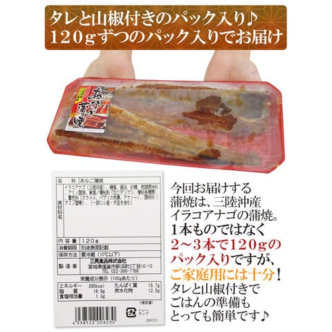 | 原材料 | イラコアナゴ(三陸沖産)、糖蜜、醤油、砂糖、発酵調味料、アミノ酸液、食塩/増粘剤(加工デンプン、増粘多糖類)、 着色料(カラメル、パプリカ色素、アナトー)、調味料(アミノ酸等)、(一部に小麦・大豆を含む)【別包 たれ 山椒】たれ[醤油(国内製造)、砂糖、水飴、米発酵調味料、蛋白加水分解物、魚介エキス/カラメル色素、調味料(アミノ酸等)、増粘剤(キサンタン)、甘味料(ソルビトール)、(一部に小麦・さば・大豆を含む)]・山椒粉[山椒、コーングリッツ] |