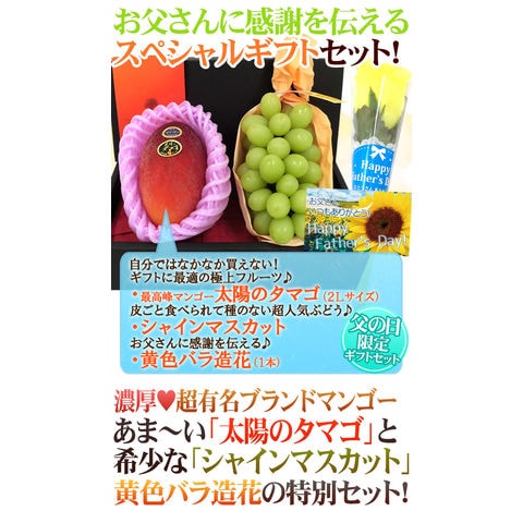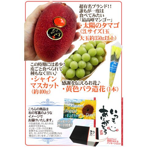 父の日ギフト ”シャインマスカット+太陽のタマゴ” 大玉2Lサイズ+黄色バラ造花1本(冷蔵便)【予約 6月14~21日お届け予定】 送料無料〈*北海道・沖縄:追加送料必要〉