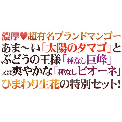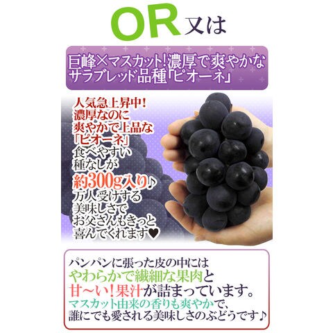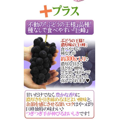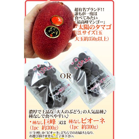 | 内容量 | マンゴー 1玉 2Lサイズ 約350g以上 種なし巨峰 又は 種なしピオーネ 1pc 約300g (生ものですので多少の前後はお許しください) |