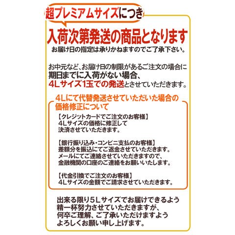 ※ 商品名に【予約】と記載されている商品が予約商品となります。 入荷開始後及び、入荷次第の発送となります。 現在まだ入荷が開始されていない商品につきましては商品タイトルに記載しております時期を目安にお考え下さい。 天候・入荷状況によってはお届け時期が大幅に前後する場合がございます。 また、予約商品についてはお届け日のご指定は不可となっております。 帰省や旅行等で、ご不在でお受け取りが出来ないお日にちがある場合は、ご注文の際にご都合の悪いお日にちを【ご要望欄】にご記入ください。 ご予定が変わった場合もその都度ご連絡いただければ、出来るだけ対応させていただきます。 お届け日の確定・お知らせは発送日当日となります。 どうぞご了承ください。 ◆ 通常商品の場合 ◆ ご注文受付後、1~5営業日の出荷となります。 入荷状況によってはお待ちいただくこともございます。 なお、ご注文のタイミングによっては即日の発送となる場合もございますのでご都合の悪いお日にち等ございましたらご注文の際、【ご要望欄】にお書き頂きますようお願い申し上げます。 ご希望のお届け日がある場合は【ご要望欄】にその旨ご記入ください。 ※なるべく前もってのご注文をおすすめ致します。 入荷状況によってはご要望にお応えできない場合もございます。 その際は早めにご連絡させていただきます。 |