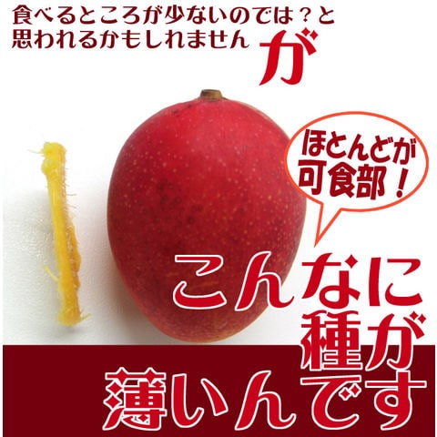 マンゴーはウルシ科の植物です。 体質によっては果汁等でかぶれることがありますので、 ご心配な方は、フォークなどを使用して 直接皮膚に触れないようにご注意ください。 |