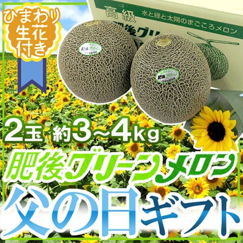 父の日ギフト ”肥後グリーンメロン” 秀品 2玉 約3~4kg+ひまわり生花1本【予約 6月14~21日お届け予定】 送料無料〈*北海道・沖縄:追加送料必要〉
