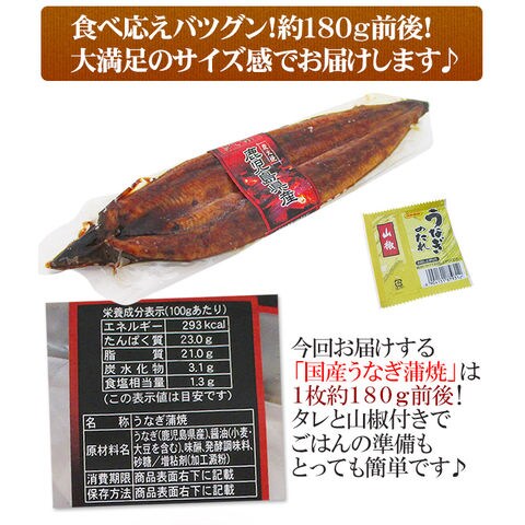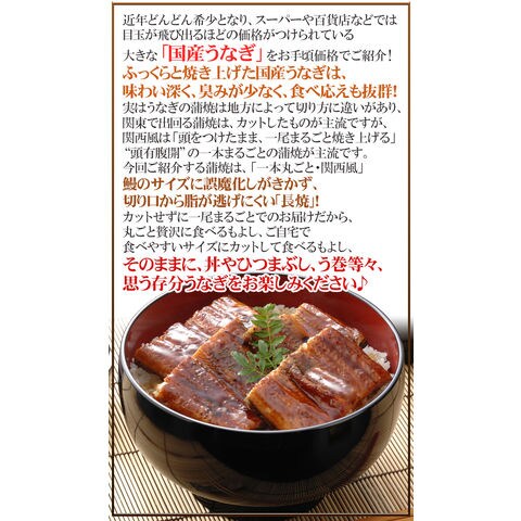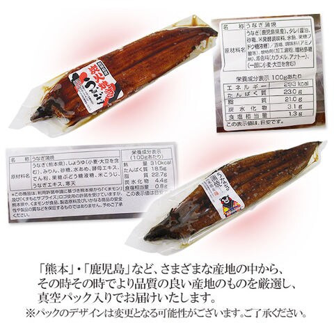 | 原材料 | うなぎ、しょうゆ、砂糖、果糖ブドウ糖液糖、焼酎甲類、みりん、水あめ、増粘剤(加工デンプン、増粘多糖類)、調味料(アミノ酸等)、酒精、着色料(カラメル)、(原材料の一部に小麦、大豆を含む)(入荷によって変更となる場合があります) |