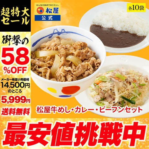 ●内容量:松屋味付け焼きビーフン&プレミアム仕様牛めし&カレー 各10袋/計30食