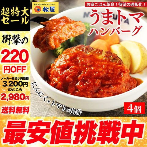 【今だけ特別価格!1食745円!】松屋 公式 うまトマ うまトマハンバーグ 4食 ハンバーグ トマト にんにく トマトソース オリジナルソース 簡単調理 牛肉 肉 食事 おつまみ お取り寄せ レンジ お惣菜 保存食 防災食 仕送り 非常食 ご飯のお供