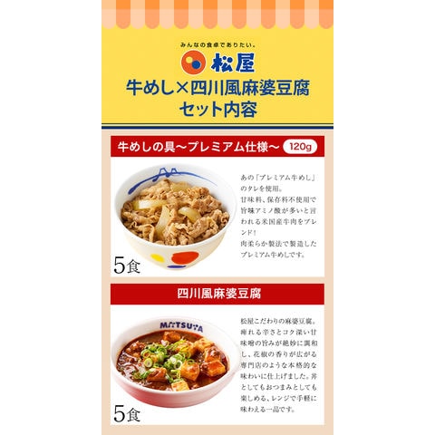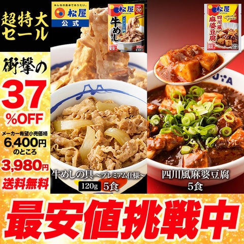 【衝撃の37%OFF】 松屋 牛めしの具 120g 5食 と 麻婆豆腐 5食 計10セット 四川麻婆豆腐 四川風 中華 中華料理 まつや 牛丼 食品 グルメ 冷凍 冷凍食品 送料無料 おかず 惣菜 業務用 お弁当 レンチン お試し 食事 おつまみ 非常食