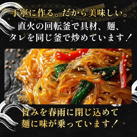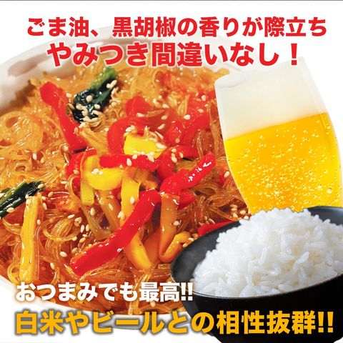 【原材料名】はるさめ(でん粉)(中国製造)、赤ピーマン(中国)、植物油脂(なたね油、ごま油)、たけのこ水煮、黄ピーマン、こまつな、にんじん、しょうゆ、砂糖、オイスターソース、コチュジャン、チキンエキス、ごま、食塩、畜肉エキス調味料、ガーリックペースト、魚介エキス、酵母エキス、酵母エキス調味料、黒ごしょう/調味料(アミノ酸等)、乳化剤、(一部に小麦・ごま・大豆・鶏肉・豚肉を含む)
