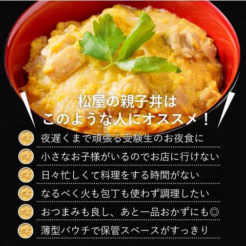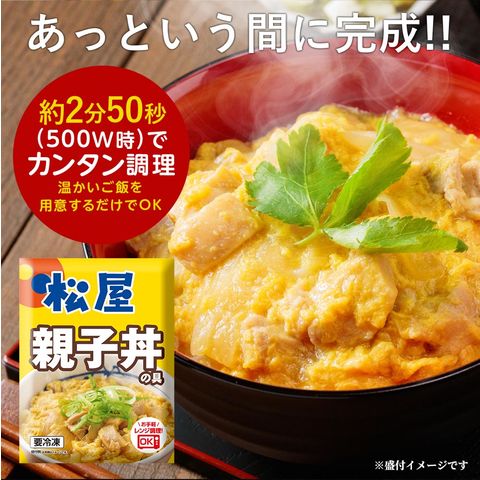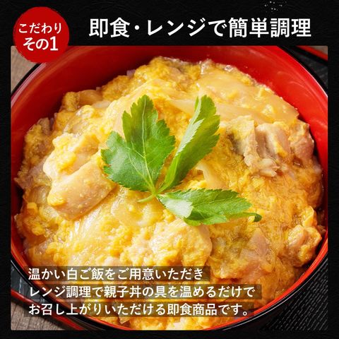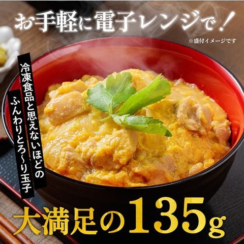 【原材料】鶏肉(ブラジル産)、玉ねぎ(中国産又は国産)、液全卵、かつおだし、しょうゆ、砂糖、清酒、本みりん、チキンブイヨン、風味調味料/増粘剤(加工でん粉、キサンタンガム)、着色料(カロチノイド)、調味料(アミノ酸等)、(一部に卵・小麦・さば・大豆・鶏肉を含む)