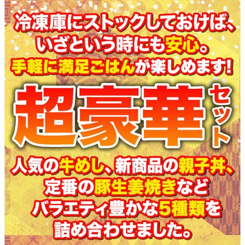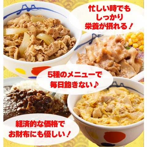 1.牛めしの具プレミアム仕様×4食 2.親子丼の具×4食 3.豚生姜焼き×4食 4.松屋オリジナルカレー×4食 5.豚生姜焼きバーガー×4個 |
