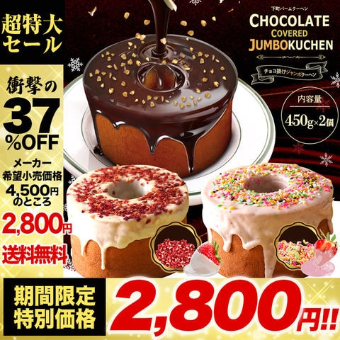 【メーカー希望小売価格4,500円⇒2,800円】 チョコがけスーパージャンボクーヘン2個 超ド級1個450gホワイトストロベリー味・ストロベリースプリンクル味各1個(450g×2)