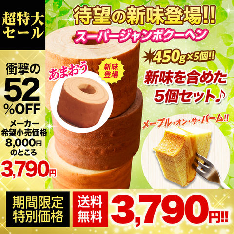 【メーカー希望小売価格8,000円⇒3,790円】 【1個450gの超ド級サイズ】 スーパージャンボクーヘン5個 バニラ・キャラメル・メープル・紅茶・あまおう おすすめ C