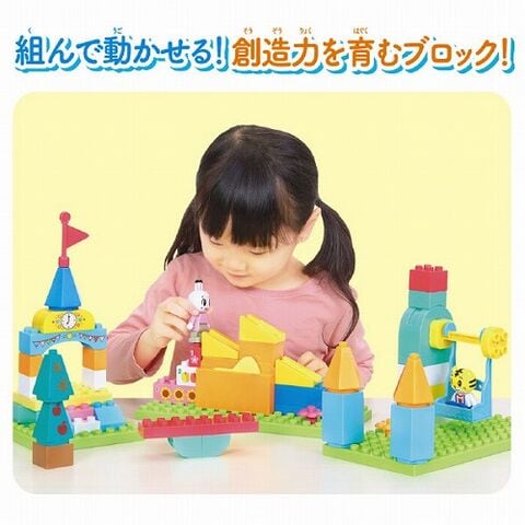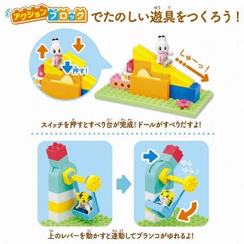 スイッチを押すとブロックが上下するアクションブロックや、レバーと連動してゆれるアクションブロックなどを使ってお子さまになじみのある公園のすべり台やブランコ、その他様々なものを作ることができます。
