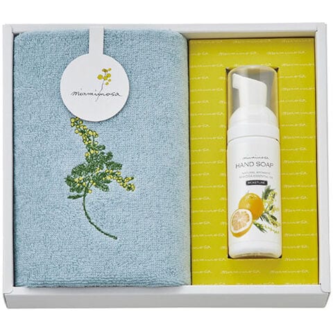 春を告げる花ミモザをモチーフとした今治タオルと、天然香料ミモザ精油とグレープフルーツの香りが爽やかな、アミノ酸系洗浄成分配合のクリーミィーな泡で手肌をやさしく洗い上げるハンドソープのセットです。
