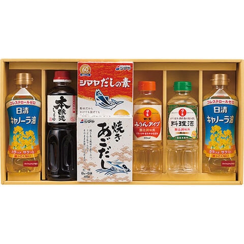 セット内容 : 日清キャノーラ油(350g)×2、サンビシ本醸造しょうゆ(500ml)・日の出料理酒・日の出割烹みりんタイプ(各400ml)・シマヤだしの素粉末(10g×6袋)・シマヤ焼きあごだし(8g×6袋)×各1