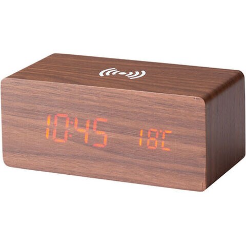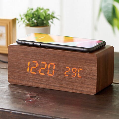 スマートフォンを置くだけで充電できるワイヤレス充電機能付の多機能時計です。アラームは3種設定可能。時計の表示は常時点灯の他、振動センサーで必要な時だけ点灯するように設定する事も可能です。電源:USB、単4電池3本使用(別売)、お試し用CR2032ボタン電池1個(内蔵※電池は時計用予備電源です)。