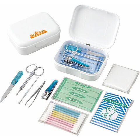 セット内容 : カラー綿棒×10、キズテープM・コットンパフ×各3、専用ケース(11×8×4cm)・爪切り・エチケットハサミ・耳かき・毛抜き兼ピンセット・爪ヤスリ・ワンタッチ包帯×各1