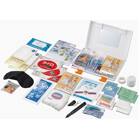 セット内容 : キズテープM(3枚)・ワンタッチ包帯・コットンパフ(3枚)・カイロ・携帯トイレ・マスク(2枚)・カラー綿棒(10本)×各2、専用ケース(25×18×4.5cm)・冷却シート(2枚)・伸縮包帯・ウェットティッシュ・グルーミング5点セット・ガーゼ(大)・サージカルテープ・ポケットレインコート・保温断熱シート・ホイッスルライト(ボールペン付)・安眠セット×各1