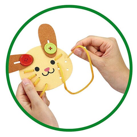ひも通しとボタン遊びで指先のトレーニング!耳の角度でかわいい犬にも!