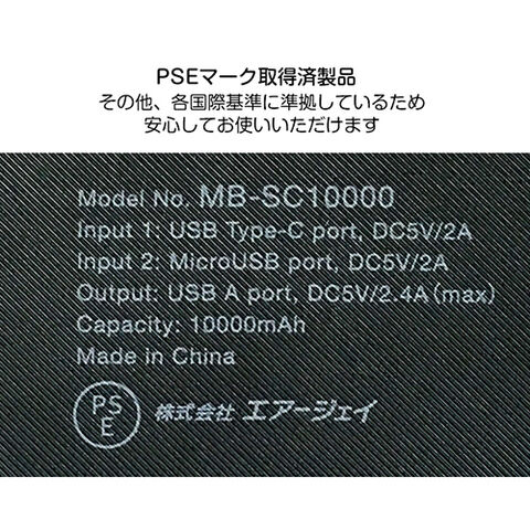 エアージェイ 10000mAh 大容量コンパクトモバイルバッテリー ブラック MB-SC10000BK