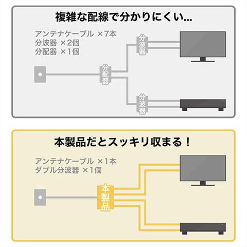 信号の分配と分波が本機一つで可能になり、テレビとレコーダーなどへの接続が無駄なくすっきりと行えます。