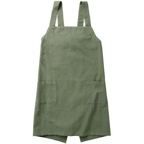 ・着脱のしやすいバッククロスタイプエプロン。ササっと被ることができるので忙しい方にもおススメのデザイン。ゆったりとした着心地になっています。