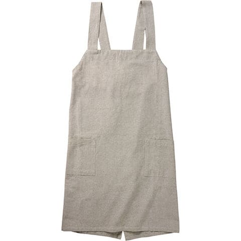 ・着脱のしやすいバッククロスタイプエプロン。ササっと被ることができるので忙しい方にもおススメのデザイン。ゆったりとした着心地になっています。