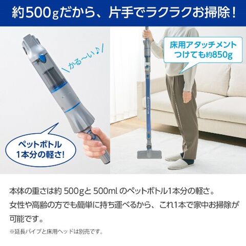 ●本体の重さは約510gと500mlのペットボトル1本分の軽さ。女性や高齢の方でも簡単に持ち運べるから、これ1本で家中お掃除が可能です。