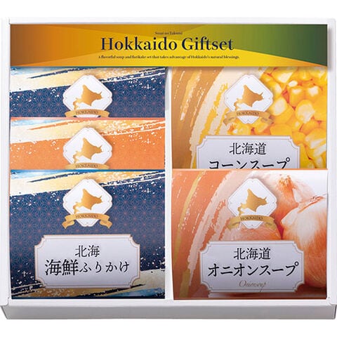 セット内容 : 北海海鮮ふりかけ(3g)×6、北海道野菜ふりかけ(3g)×3、北海道コーンスープ(16.5g)・北海道オニオンスープ(7g)×各2