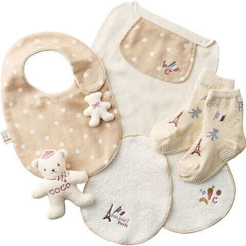 セット内容 : 授乳スタイ×2、クマモチーフ付スタイ・ソックス(11~13cm)・ガラガラ・汗とりパット・竹籠(23.5×31.5×8cm)×各1