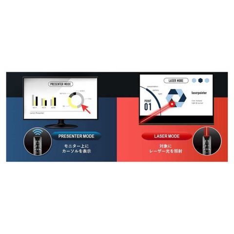 ●画面上にカーソール表示しプレゼンシーンに合わせた最適なポインティングを可能にするプレゼンターモードと、いつでもどこでも直感的なポインティングを実現するレーザーモードの、2通りの使用が可能な2wayプレゼンター。
