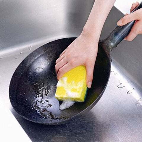 泡立ちの良いウレタンと研磨粒子入り不織布でコゲを落とします。