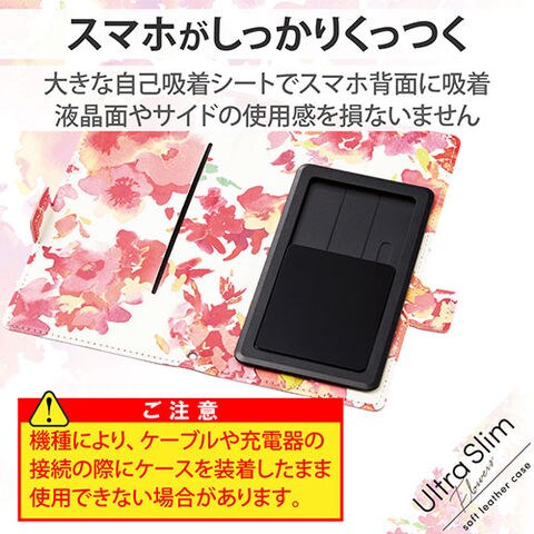 スマートフォンがピタッとくっつく自己吸着シートを採用し、機種を選ばず使用できる、ケース内側に愛らしいフラワープリントを施した薄型・軽量タイプの手帳型マルチカバー。