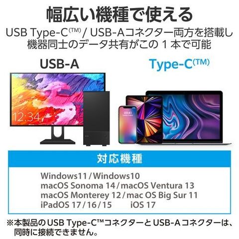 ●Windows パソコン、Mac、Android搭載のスマートフォンやタブレット、USB Type-C?コネクターを搭載したiPhone・iPadなど、機器同士のデータ共有がこの1本で可能です。