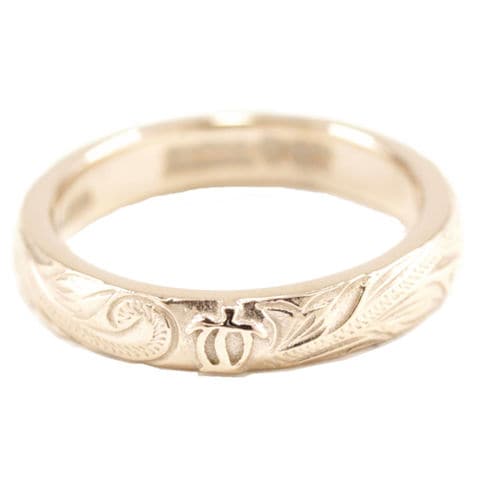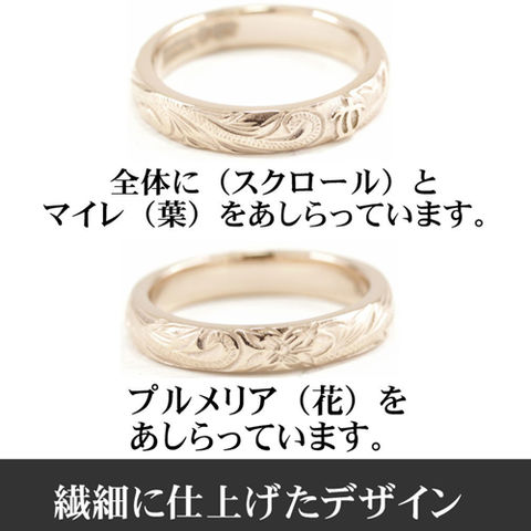 ホヌをモチーフに、途切れることない愛を意味するスクロール(波)や愛や幸せを育むプルメリア、絆を意味するマイレ(葉)を繊細にあしらっています。
