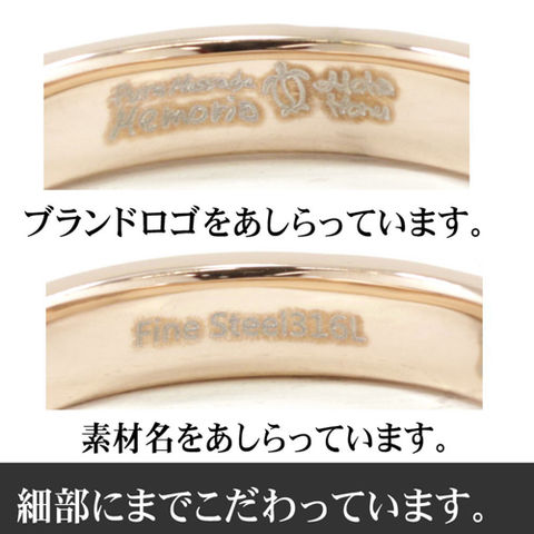 水・汗に強く、変色しにくい素材なのでいつまでも輝きが保てます。また非常に硬度が高く傷が付きにくいのが特徴です。