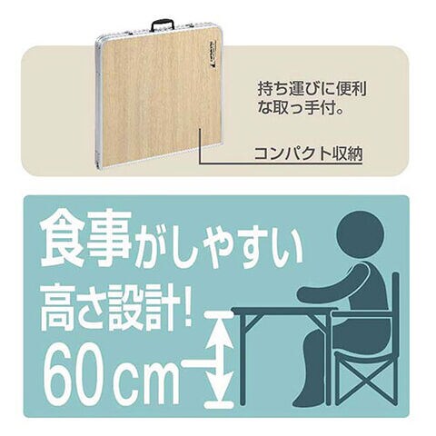 ○キャンプをもっと快適に! 食事がしやすい高さ設計! あたたかみのある木目調天板。
