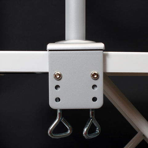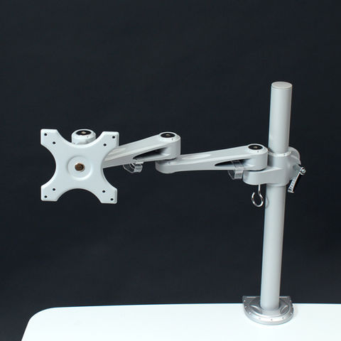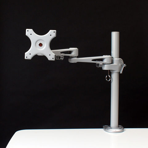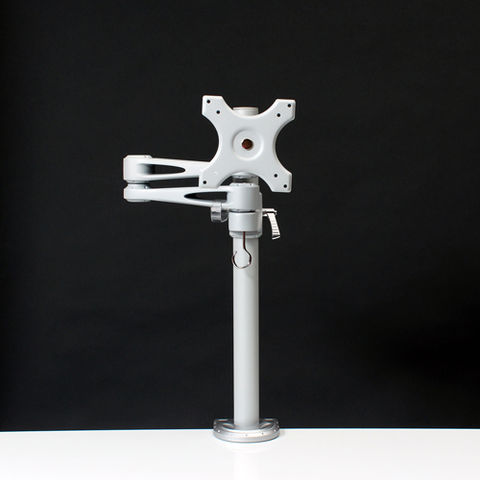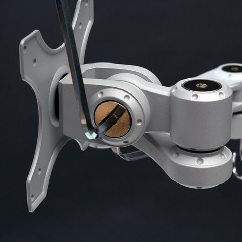 4つの軸を動かすことで、奥行きのない机でも広々ご利用いただけます。軸の移動で、多彩なモニター角度に変更可能。支柱の取り付けは手でハンドルを回すだけ。