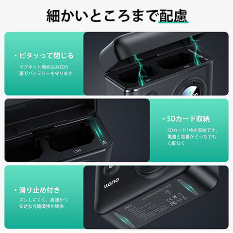 さらに、蓋はマグネット埋め込み式なので、バッテリー収納ボックスとしても利用可能、SDカードスロットも設置され、収納バッグも付属していますので、外出、旅行時にお役に立ちます。
