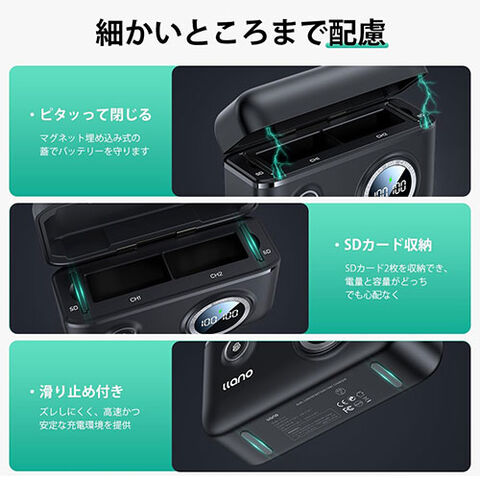 充電器本体にはLEDディスプレイが搭載され、ボタンを押すだけでカメラバッテリー残量がすぐ分かりますので、カメラにバッテリーを装着して残量を確認する必要もなく便利。さらに、蓋はマグネット埋め込み式なので、バッテリー収納ボックスとしても利用可能、SDカードスロットも設置され、収納バッグも付属していますので、外出、旅行時にお役に立ちます。