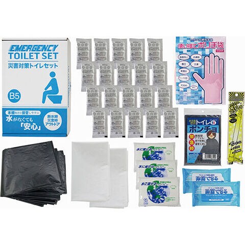 セット内容 : 抗菌剤入凝固剤・排便処理袋×各20、水に流せるペーパー×3、収納外袋・除菌アルコールウェットティッシュ×各2、ポリ手袋・トイレポンチョ・発光スティック×各1