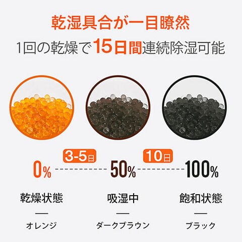 1回の乾燥で15日間連続除湿可能です。除湿ペレットがオレンジの場合は、本体は乾燥状態になります。
