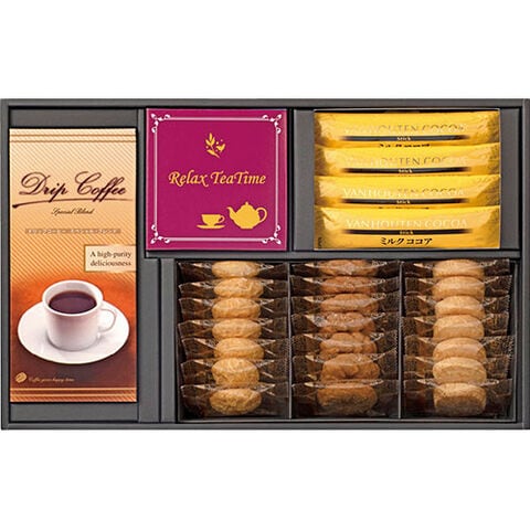 セット内容 : バンホーテンミルクココア×8、クッキー(ジャムピール・フルーツ・ディアマン)×各7、ダージリンティーバッグ(6袋)・モンカフェドリップコーヒー(スペシャルブレンド)(4袋)×各1