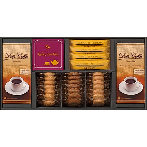 セット内容 : バンホーテンミルクココア×8、クッキー(ジャムピール・フルーツ・ディアマン)×各7、モンカフェドリップコーヒー(スペシャルブレンド)(4袋)×2、ダージリンティーバッグ(6袋)×1