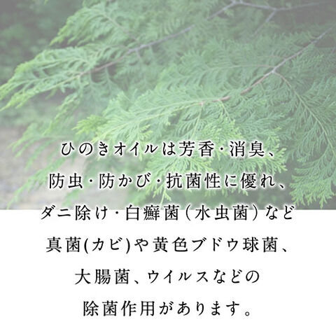 芳香・消臭、防虫・防かび・抗菌性に優れ、ダニ除け・白癬菌(水虫菌)など真菌(カビ)や黄色ブドウ球菌、大腸菌、ウイルスなどの除菌作用があります。