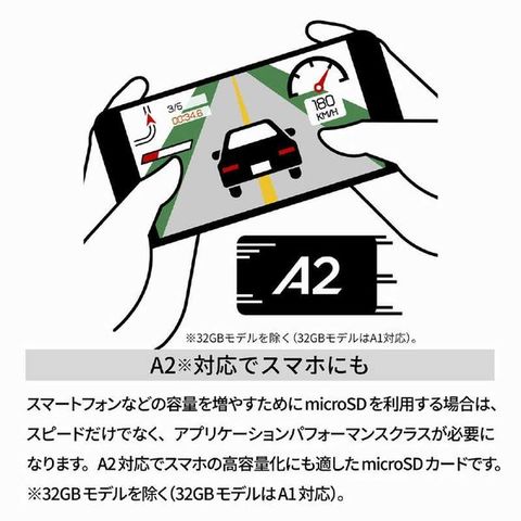 ●スマートフォンなどの容量を増やすためにmicroSDを利用する場合は、スピードだけでなく、アプリケーションパフォーマンスクラスが必要になります。A2対応でスマホの高容量化にも適したmicroSDカードです。