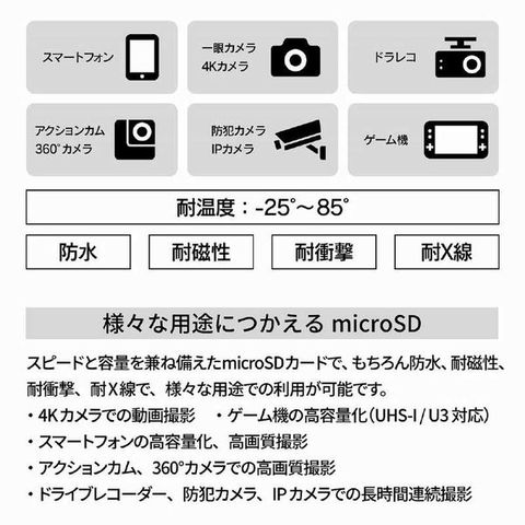 ●スピードと容量を兼ね備えたmicroSDカードで、もちろん防水、耐磁性、耐衝撃、耐X線で、様々な用途での利用が可能です。