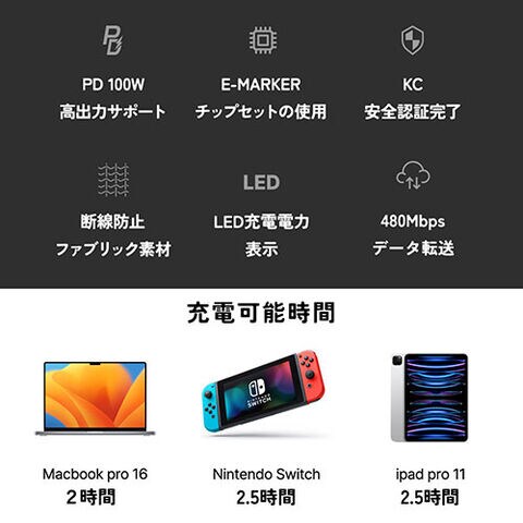 最大100Wまで高出力が可能でCタイプの高出力の仕様が必要なノートパソコンやタブレットも迅速かつ完全な高速充電が可能で、PPS、PDなどさまざまな高速充電技術をサポートしています。