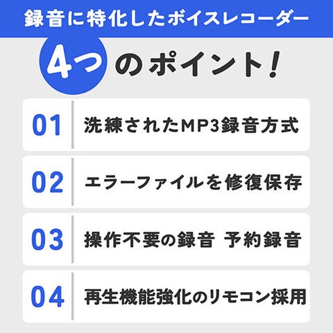 メモリー容量を抑えつつも高品質に音声を収録できます。