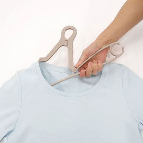 〇ハンガーの肩部を握るとキャッチ部が倒れるので、丸首シャツもラクに干せます。